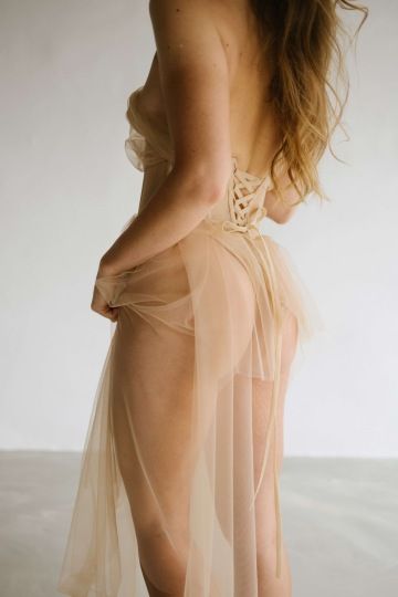 Jemný tylový korzet v odstínu tělové barvy s vyšívanou krajkou, který objímá siluetu a propracované šněrování na zádech umožňuje dokonalé přizpůsobení postavě.