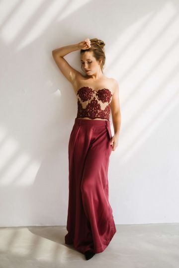 Luxusní korzet v odstínech vínové a champagne barvy, ručně zdobený jemnou krajkou s bohatou výšivkou.