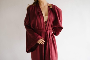 Elegantní župan z jemného saténu v odstínu vínové barvy. Volný střih se širokými rukávy a páskem v pase působí uvolněně, ale zároveň sofistikovaně.